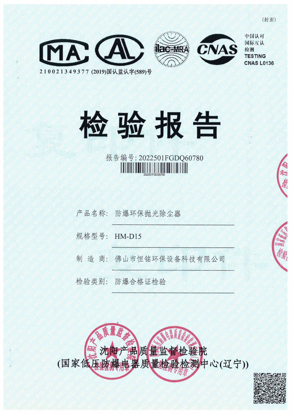HM-D15防爆环保抛光除尘器检验报告