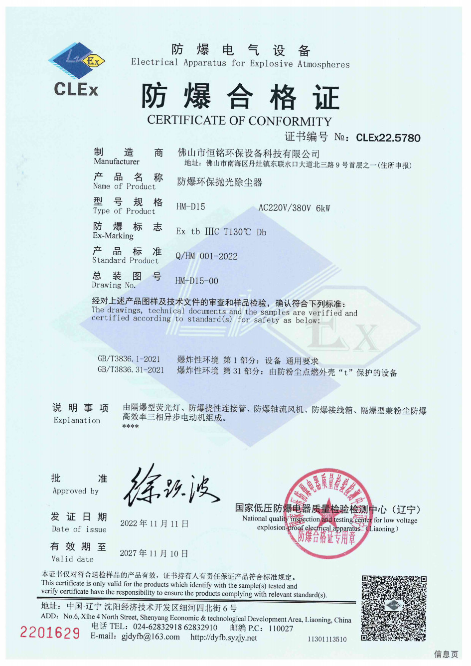 HM-D15防爆环保抛光除尘器检验报告